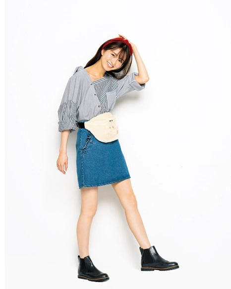 アシメストライプシャツ6,990円+税/REDYAZEL ルミネエスト新宿店 デニムスカパン6,400円+税/titty&Co.ルミネエスト新宿店 リボンヘッドバンド1,000円+税/Osewaya(お世話や) ファーウエストポーチ2,900円+税/casiTA サ イドゴアブーツ15,800円+税/エンチャンテッド(グランデ)