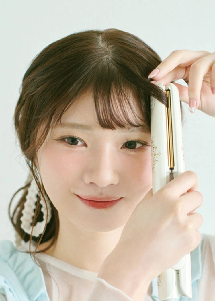 前髪は一度にカールをつけずに2cm幅ずつ分けてとる。ストレートアイロンで内巻きにし、そのまま左側に引き抜くようにして通す。ふんわり感を意識。