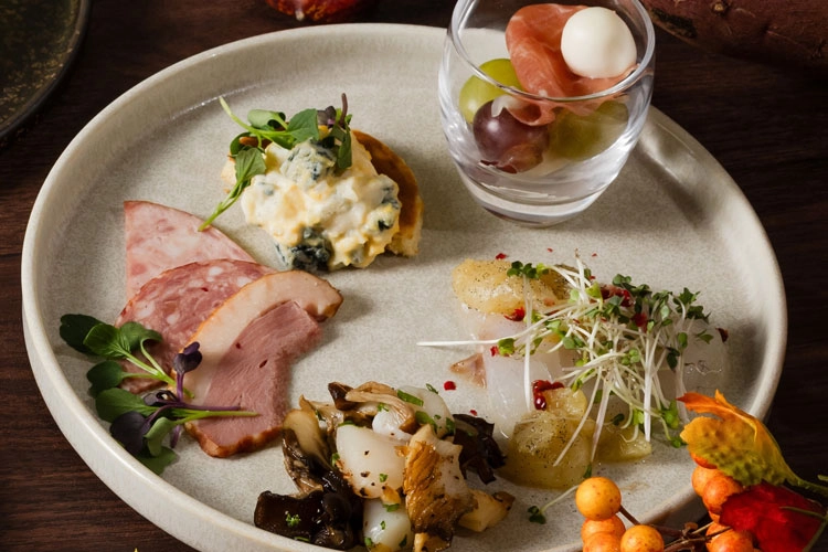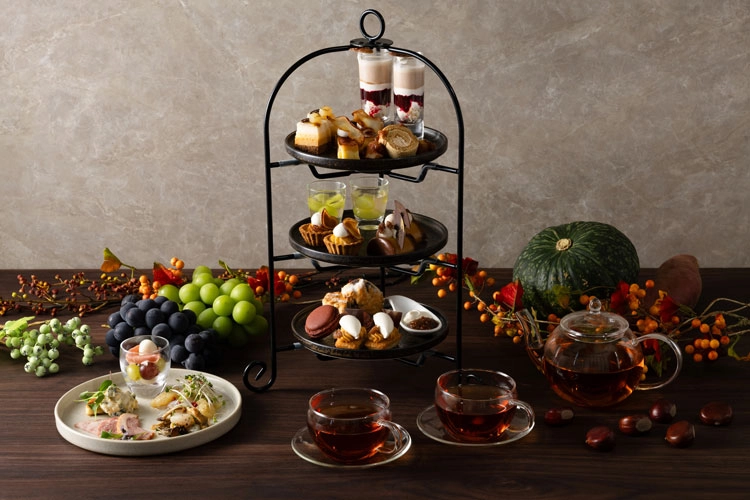 旬の栗の上品な甘みとキャラメルのほろ苦さが絶妙に調和したスイーツ10種と、豊洲直送の鮮魚や旬野菜を使用したセイボリー5種、スコーンが楽しめる「“栗×キャラメル”オータムアフタヌーンティー」。
