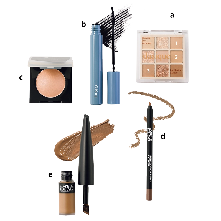 a-1&2を混ぜたカラーを上まぶたに、それより少し濃いa-3を下まぶたに入れて重心を下げる。bを上下まつ毛に束っぽく塗る。