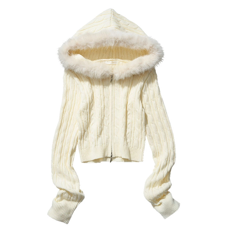 細かいケーブル編みが可愛い印象を与えるニットトップス。平成みのあるファーつき。
