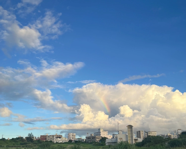 「沖縄コレクションの帰り道、バスで空港へ向かう途中に虹が出現。みんなでテンション上がりました♡ そんな思い出の詰まった1枚です。(少ししか見えてないけど 笑)」