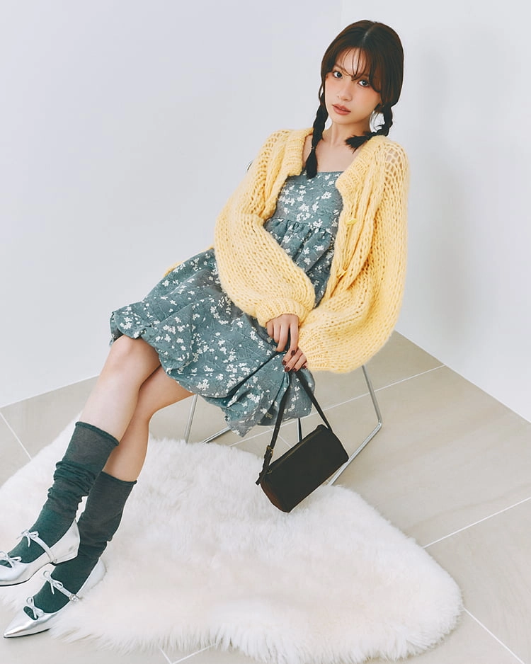 着映え確実なやわらかイエローがおカワ。ゆるいカギ針編み越しの肌見せがあざとい♡