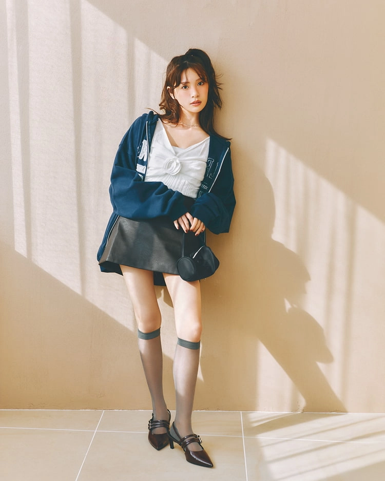 だからこそ、甘さ重視でとことんガーリーに仕上げて、レザーでほんのり辛さを潜ませるくらいがちょうどいい。