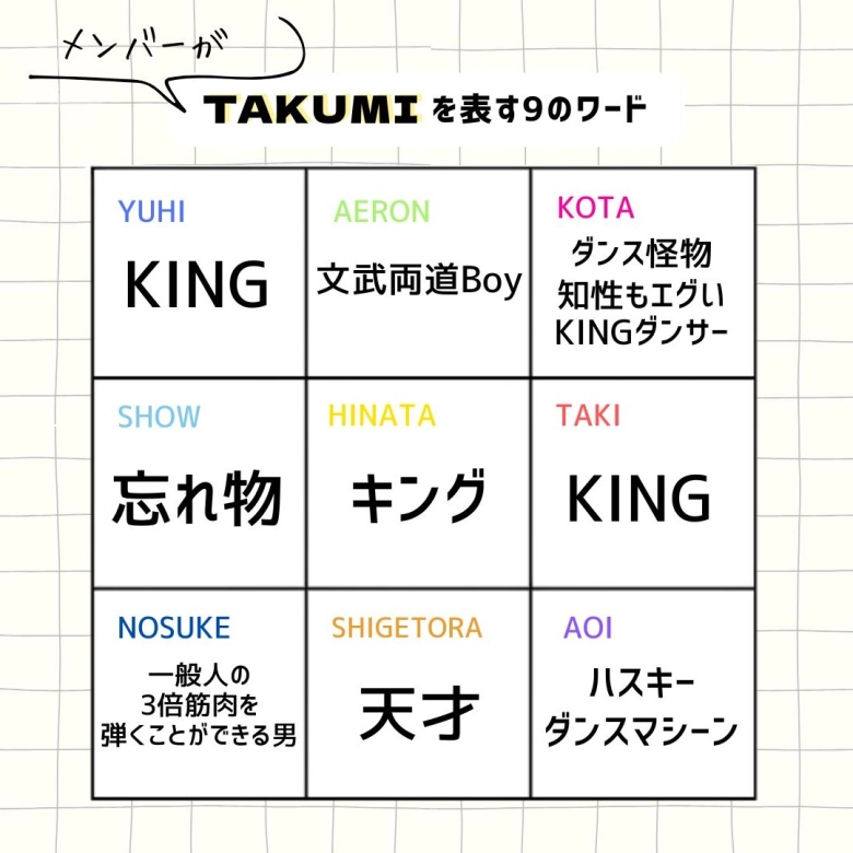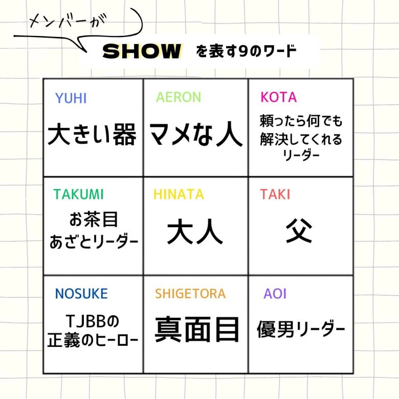 SHOW「ちょっと天然で、この自分を表す9つのワードを書くときも、単語で書けばいいのに、TAKUMIが最初漢字一文字で書いちゃってて…途中で単語で書けばいいんだと気づいたのに、2、3個書いたらまた忘れて漢字一文字に戻ってるっていう…(笑)」