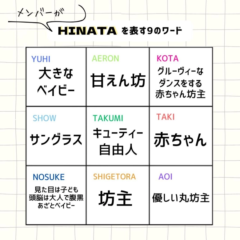 HINATA「このグループで唯一社会人経験があって、しっかりしていて優しいし…このチームはこの人がいないとまとまらないと思います。あと、周りから愛されていて、人との接し方が素敵だなと思うので、尊敬しています」