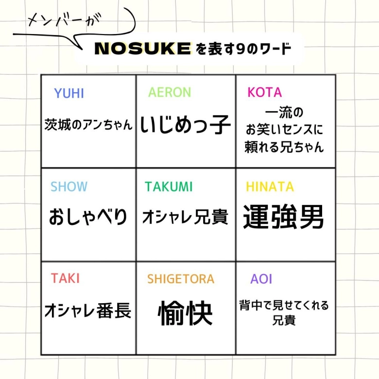 KOTA「第一印象といちばんイメージが違うのはNOSUKEくんですね。初めての顔あわせのとき、彼はドレッドヘアだったんです。やんちゃなイメージで、なんだか強そうな人と思っていたら、すごく話しやすいし可愛がってくれるんです。自分には兄貴がひとりいるんですけど、気を使わずにずっといられる本当の兄貴のような存在です。お笑いセンスもあるので、ずっと笑わせてもらっています」