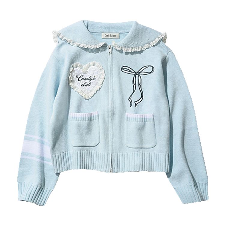 フリルつきの襟とポケットが目を引くニットパーカー。リボン刺しゅうがおかわ♡