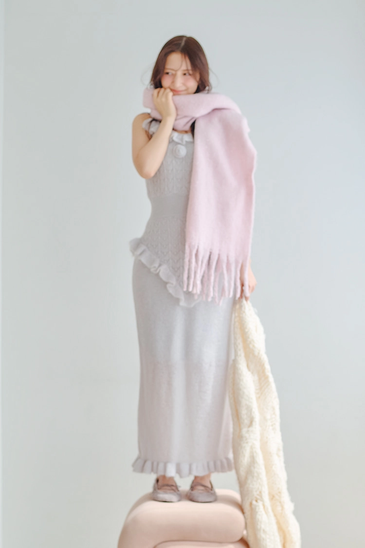 今季トレンドのマフラーは愛されカラーの定番ピンクを。肌の透明感をアップさせるペールカラーを選んでこそ、真の沼らせガール。マフラーに編み込んだラメで恋にトキメク気持ちを表現して。