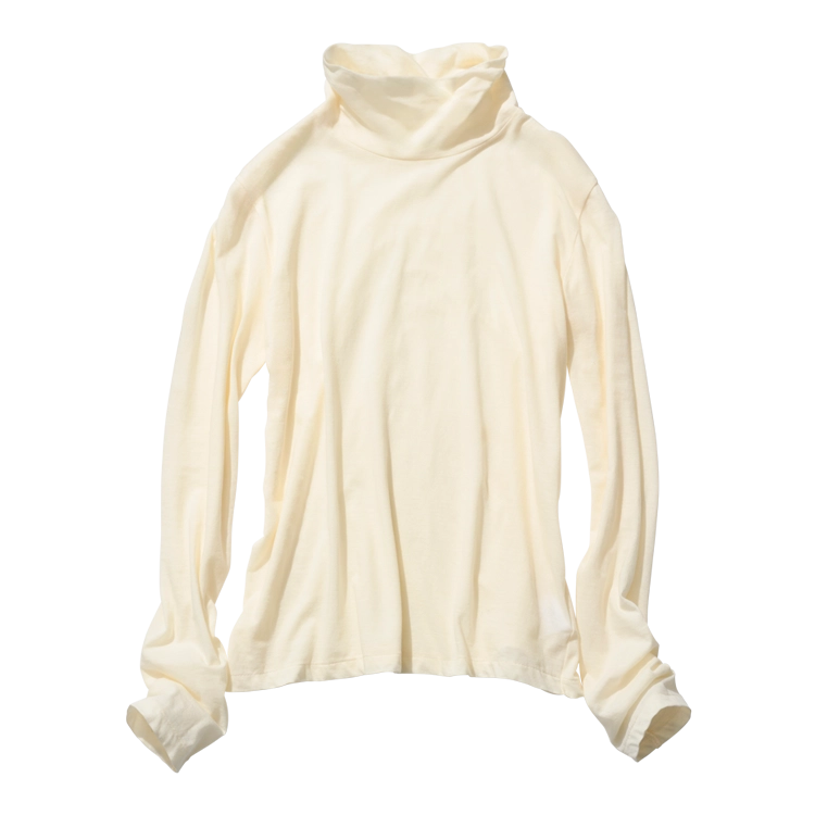 インナーとしても、1枚でも大活躍するタートルネック。クセのないシンプルなホワイトなら、清楚感と大人っぽさをプラスできる。