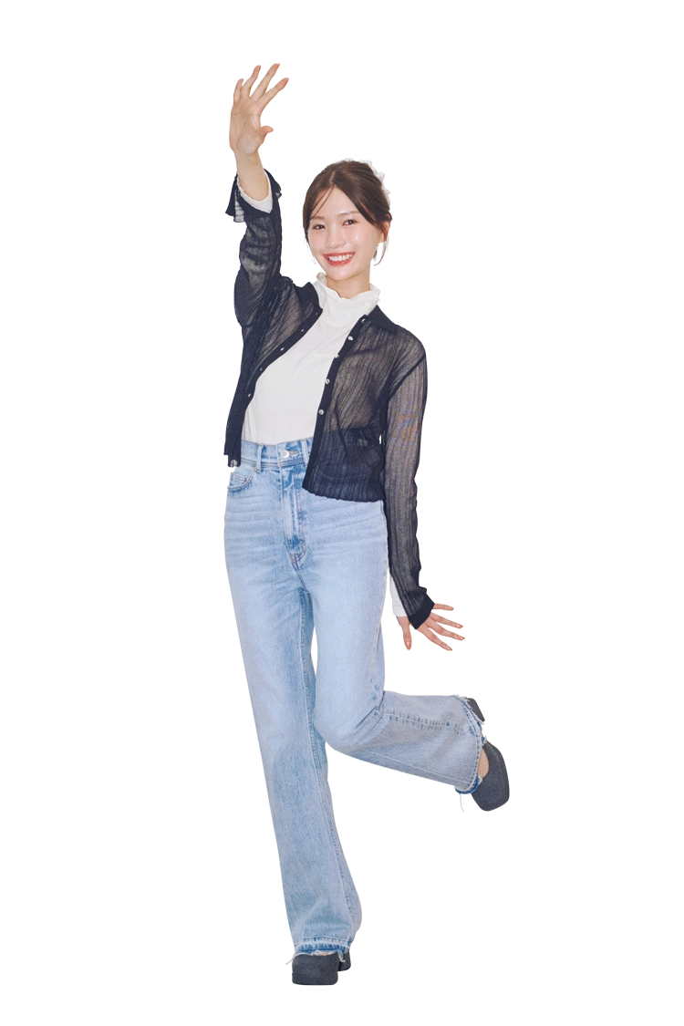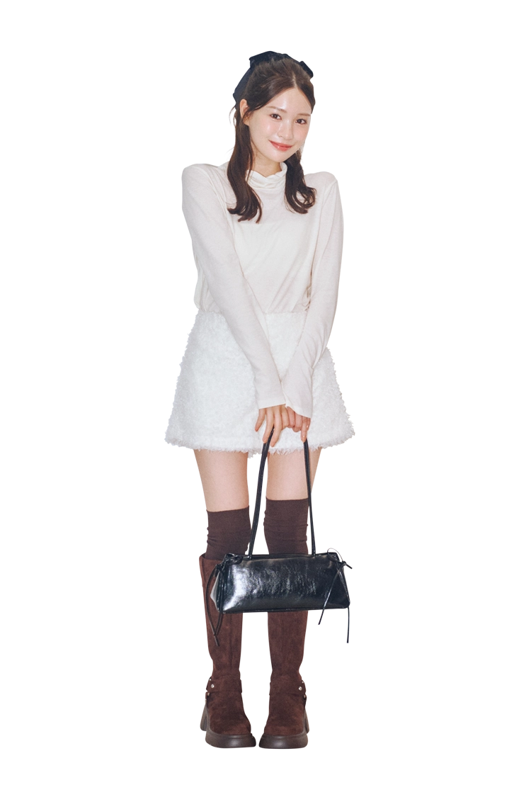 マイクロミニ丈のスカートで大胆に脚見せしてKドル風に♡ 小物はブラックを選んでコーデ全体を引き締めて。