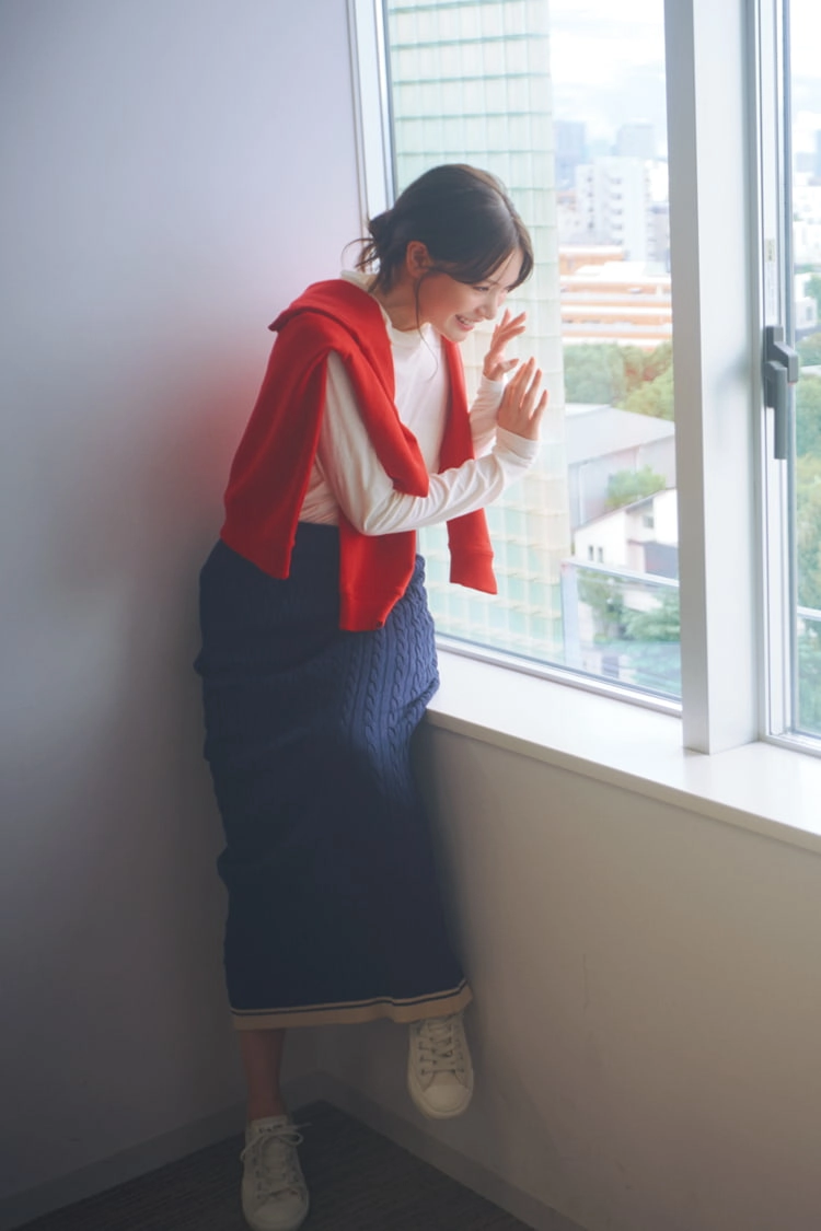 ニットスカートは、ストンと落ちるIラインシルエットで縦のラインが強調されるから、細見え効果が◎。スエットを肩にかけてこなれ感を演出して。