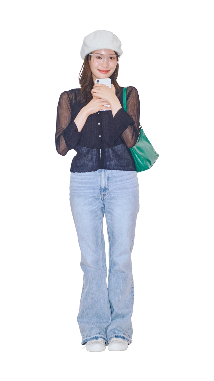 黒のシアートップスにデニムをあわせたシンプルコーデは、ベレー帽やカラーバッグで遊びをプラス。