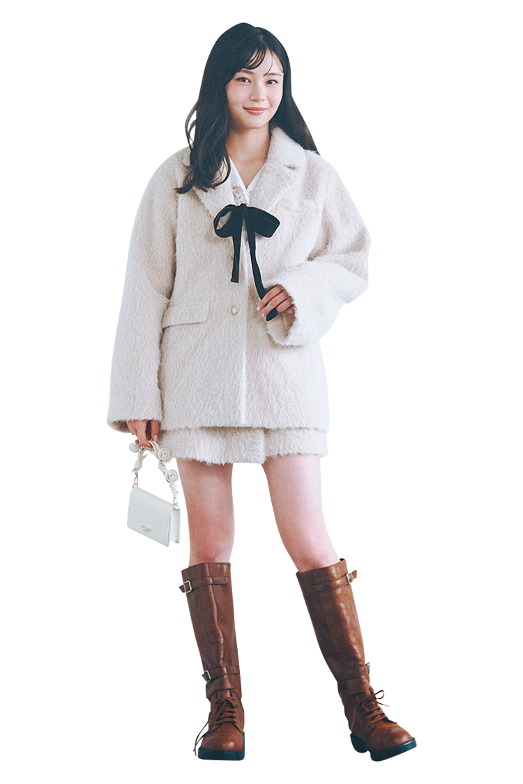 クラシカルジャケットも今年はサイズ感がさらに大きく進化!だからこそ、ミニボトムで抜けを作って全体をスッキリ見せるのがポイント。