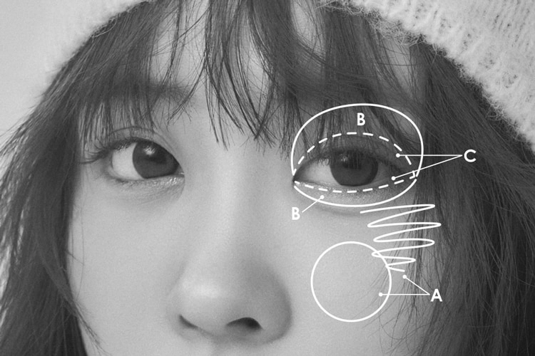Bを上下まぶたにふわっとつける。Cを上まぶたは二重幅に、下まぶたきわにはチップで細く重ねる。