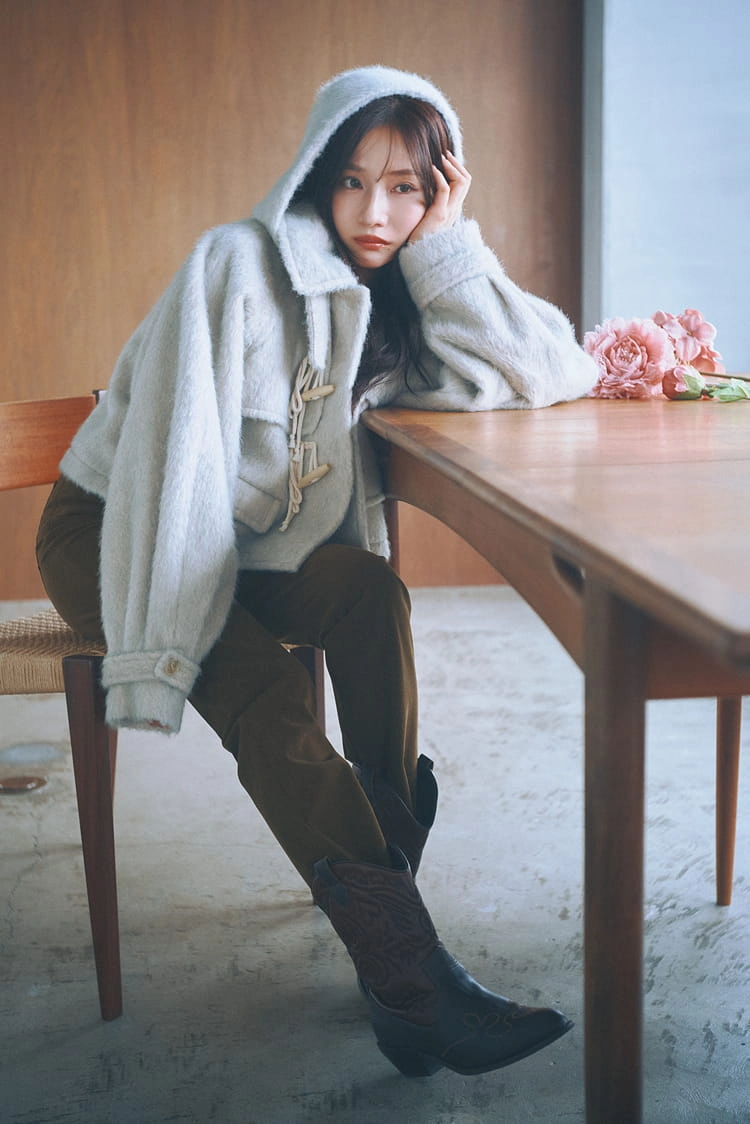 くたっとした柔らかいシャギー生地でカジュアルにも甘くも着こなせるコート。ブーツとのあわせで甘辛ガーリーな装いに。