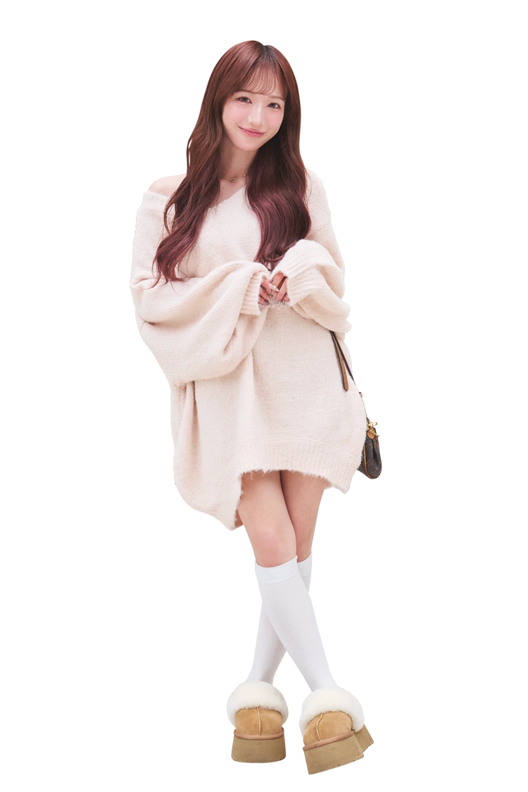 「ANDMARYで購入したニットワンピは、リボンチョーカーつきで約15,400円。オフショル×ミニ丈ワンピなので、足元はGRLの約2,000円の白ブーツで肌見せ範囲を軽減。