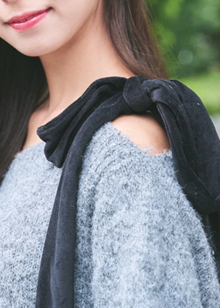 「リボンのワンショルダーがついたニットワンピはGRLで約4,000円。1枚でオトナ可愛くなれるすぐれもの。