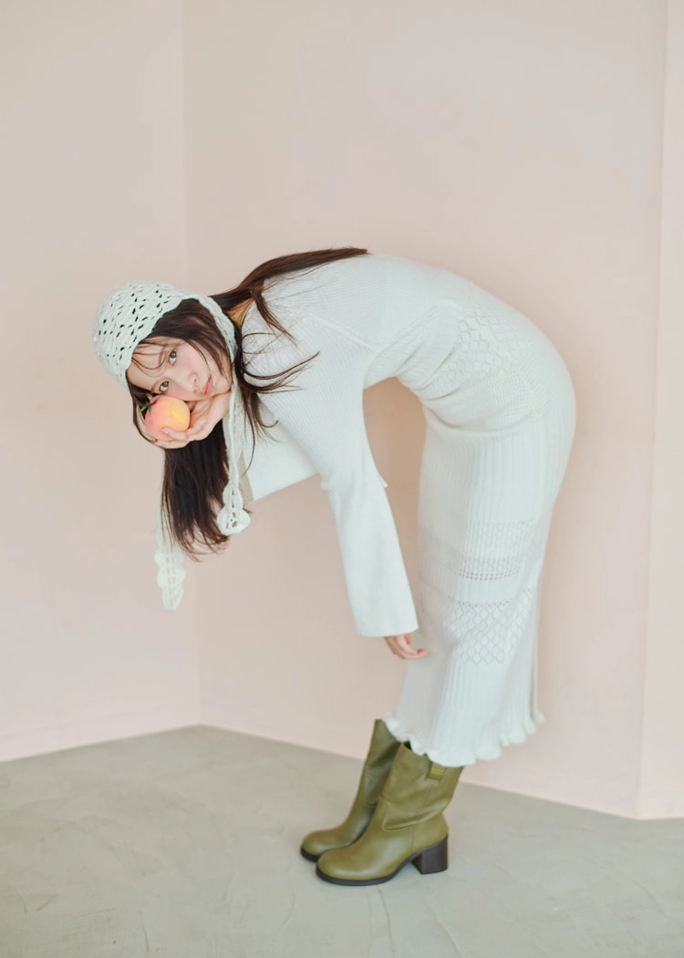 ひざ下にかけての透け感がセンシュアルなカギ針編みニット。足元は辛口なブーツでハズしてほどよい色気を狙ってこー♡