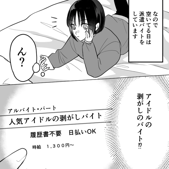 【アイドルの剥がしバイト】に応募した主人公!現場に行くと、バイト仲間に明らかにファンが混ざっていて…まさかの展開に!? COMIC2025/11/02今回、Ray WEB編集部は、派遣バイトについて読者に話を聞いて漫画にしてみました。次のページ123…7人気の漫画一覧はこちら#TAG#漫画SHARE