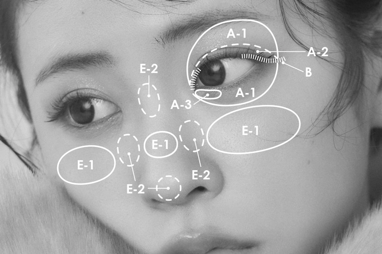 A-1を上下まぶたに広げる。Bで中間を抜いた目頭と目尻にラインを引く。このとき目頭側は太めに、目尻側は2mmほど延長。A-2を目のきわに入れてラインをぼかし、A-3を下目頭にオン。