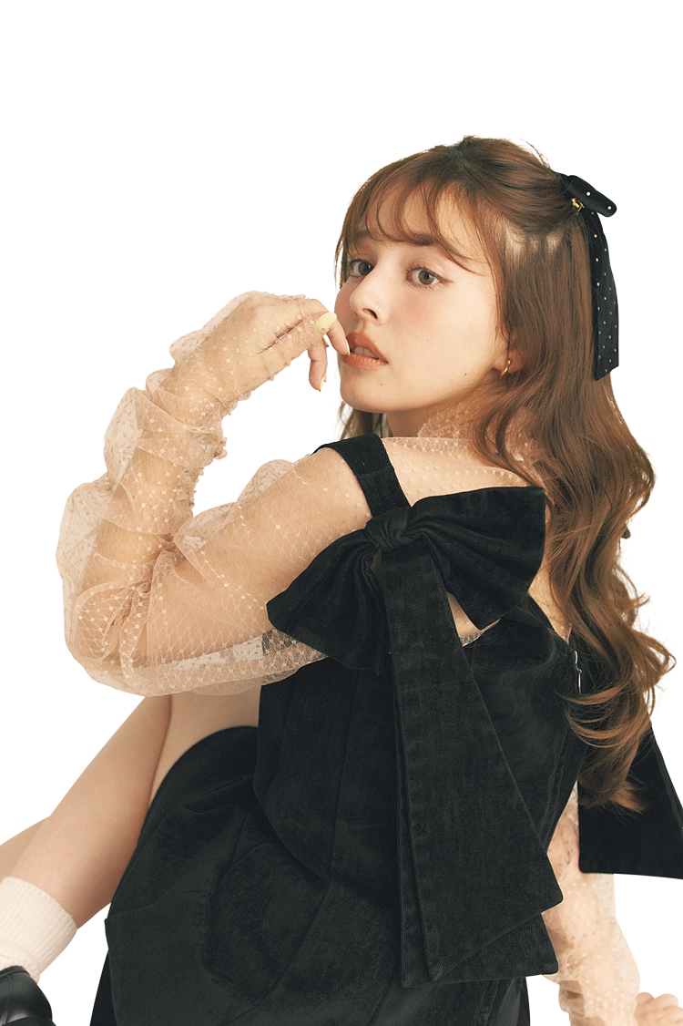 ワンピース 12,999円、シアートップス 7,999円/ともにH&M Studio Holiday コレクション(H&M)リボンバレッタ 13,200円/THE HAIR BAR TOKYO イヤリング 3,740円/ミミサンジュウサン(サンポークリエイト)ローファー 22,000円/ル タロングリーズ(ル タロン グリーズ ルミネ新宿店)ソックス/スタイリスト私物