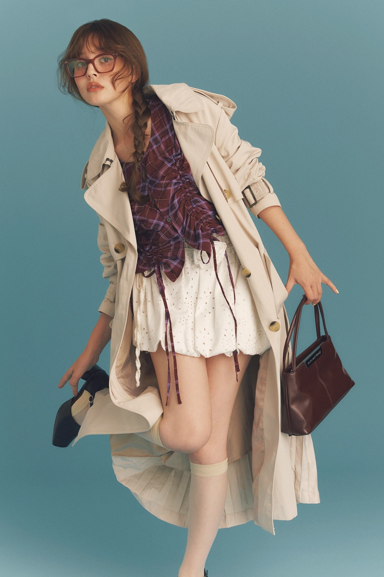 前後に入った強めのシャーリングデザインのトップスにトレンチコートをあわせて季節感◎。