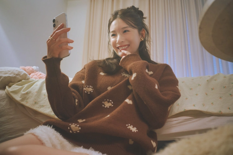 ココアブラウンのハート柄ニットをゆるっと、ふわもこ白ミニで脚見せ。抱きしめたくなる可愛さとリラックス感で、距離がぐっと縮まる♡