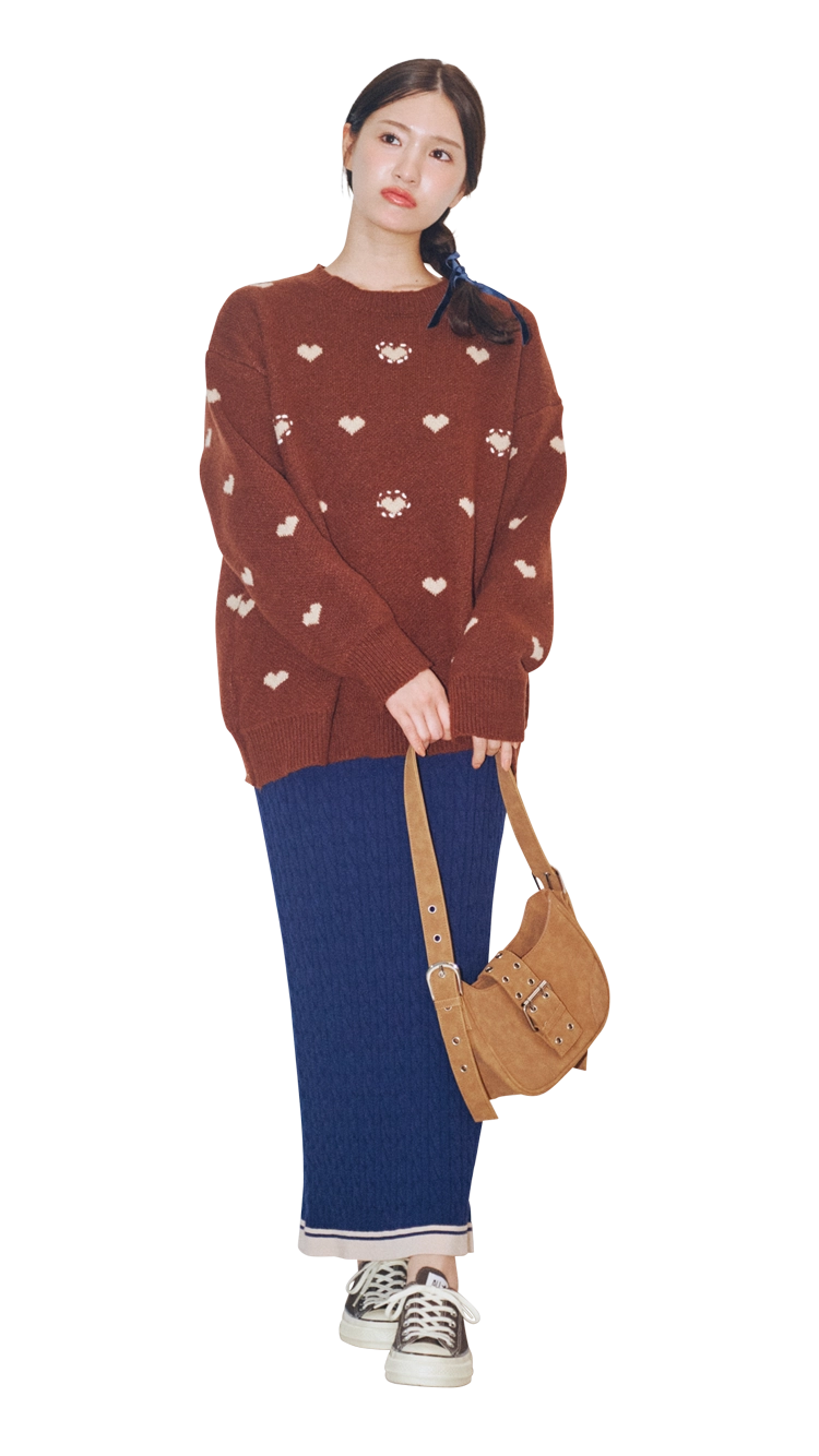 ハート柄ニットをざっくり、ネイビーのリブタイトで縦ライン強調。白スニーカーで軽さを出し、キャメルバッグでやわらかく。甘さは残しつつ、落ち着きもキープ♡