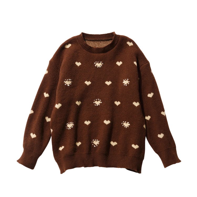 キュートなハート柄ニット。ガーリーなデザインも、ホワイトとブラウンの落ち着いた秋カラーなら、柄ボトムにもあわせやすい。