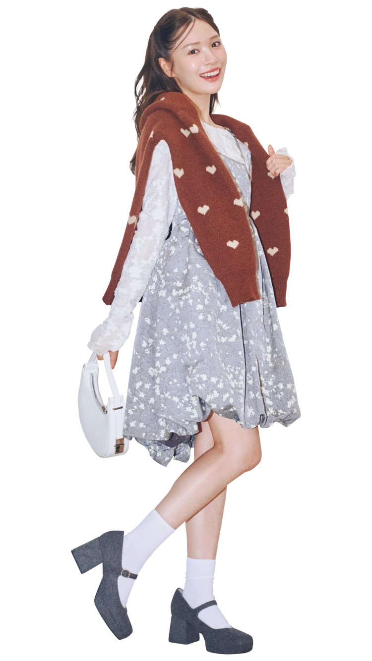 グレーの花柄ワンピに、ハート柄ニットを肩掛けして“可愛げ×きちんと”を両立。白ミニバッグで明るさを足して、写真映えも会話も弾むムードに♡