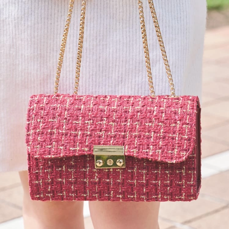 「赤のツイードのチェーンバッグで華やかに。SHEINで約3,000円」