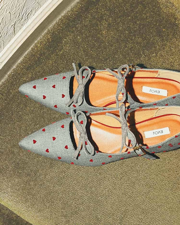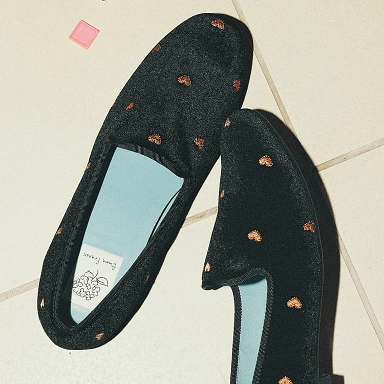 柄シューズで足元にアクセントを。ヴィンテージライクなハート柄を効かせれば、シンプルコーデも一気にこなれて見える。