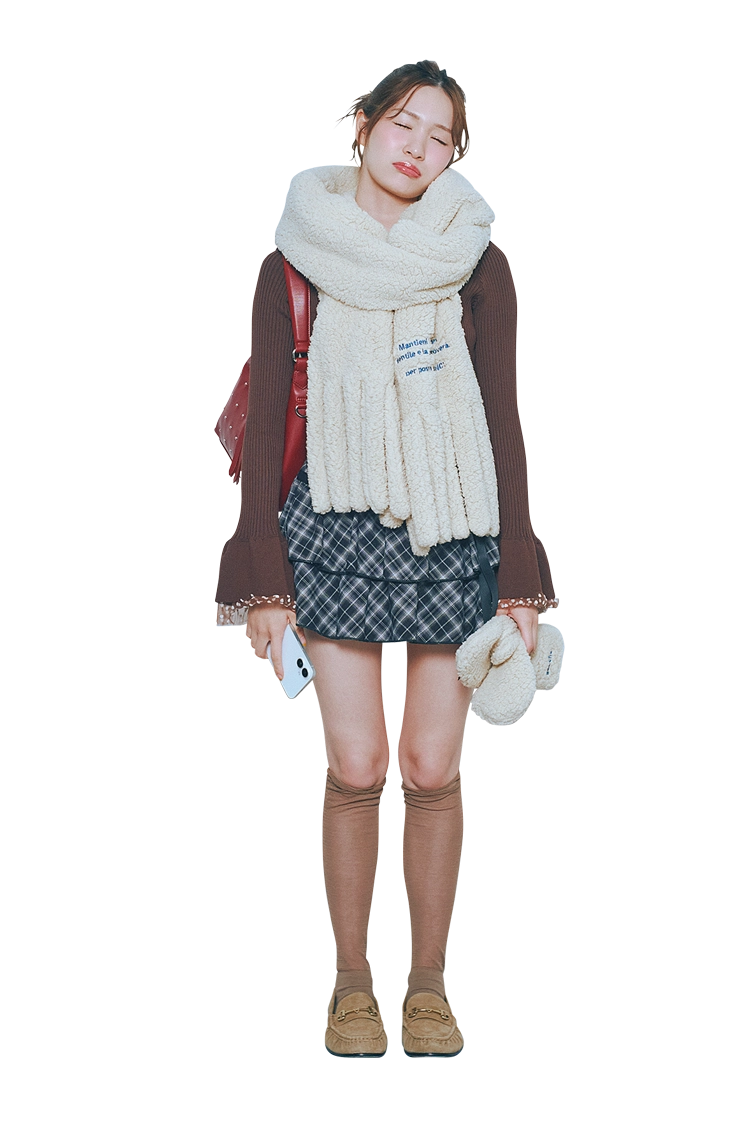 もふもふのマフラーと手袋の存在感◎。ミニスカとソックスで脚長アピも完璧!