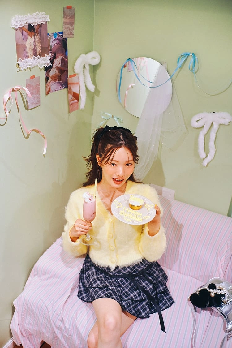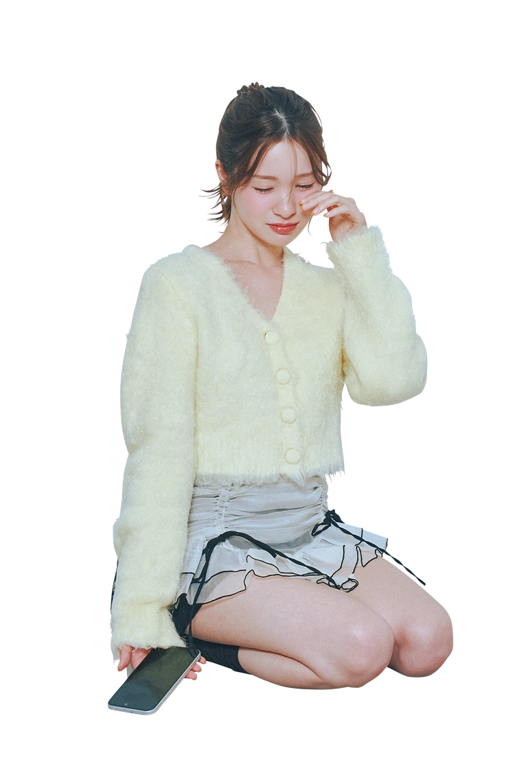 イエローカーデのふわもこ感に、リボンショートパンツで甘さと肌見せをプラス。イヤリングと白ソックスで抜け感を添えれば、おうちでの配信チェックも特別な“ときめき時間”にアップデート♡
