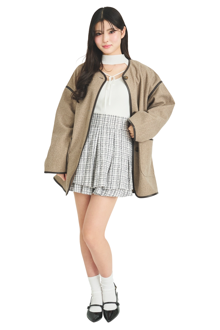 「可愛いけど、少し見慣れたコーデかも。アイボリーのニットカーディガンがゆったりめのサイズ感だから、全体が膨張して見える印象。もう少しスタイルアップを意識して!」