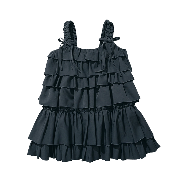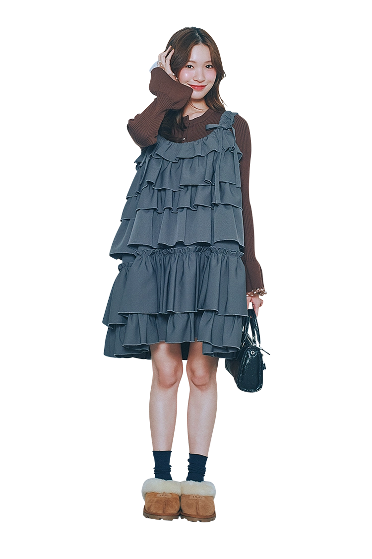 たっぷりのフリルと肩ひものリボンで糖度100%!1枚で即ビジュ映えできるから、推しとのイベントのおめかしコーデにぴったり♡