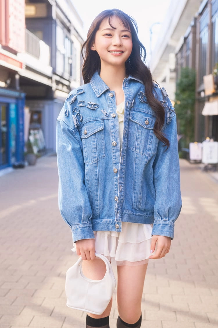 2025年5月号のインフルエンサーりなのミステリー着回しでは、デニムジャケットをまとった春のトレンドコーデにトライ!ガーリーコーデ×キュートな笑顔がとっても素敵♡