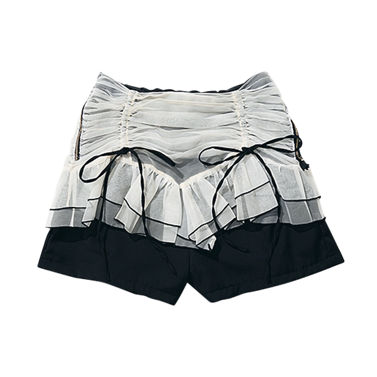 チュールとリボンのディテールが目を引くショートパンツ。ゆったりとしたトップスの下からチュールをのぞかせるのが上級者テク。