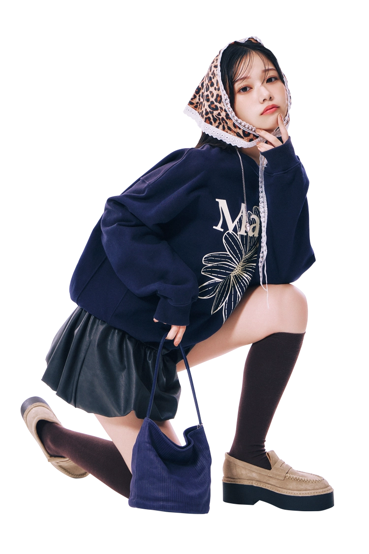 強めな主役アイテムを花柄と赤でレディにシフト。ミリタリールックに花柄がアクセント。
