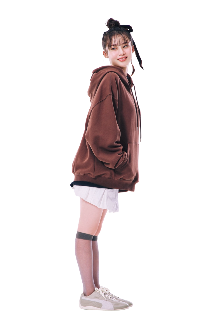 ビッグトップス×ミニできゃしゃ見えを狙って。ブラウンを主役にできる大きめパーカは、カジュアルトップスをメンズライクに見せないミニとリボンで甘さをプラス。