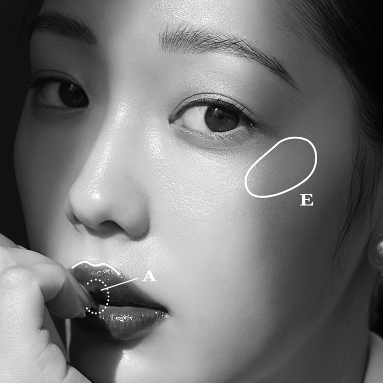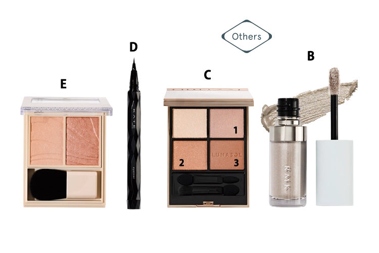 Eの2色を混ぜて、ほおのいちばん高い部分にだ円に小さくミニマムにつけて素肌感をなるべく残す。