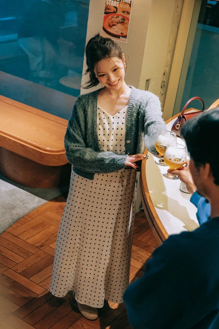 ニットカーディガン(ニットカーディガンとビスチエのセット)は着回し。ドット柄キャミワンピース 14,300円/Ungrid イヤリング 2,200円/アネモネ(サンポークリエイト)ハンドルバッグ 10,900円、ロングブーツ 14,900円/ともにチャールズ&キース(チャールズ&キース ジャパン)Cordinateグレー×デニムのオトナカジュアルなスタイル
