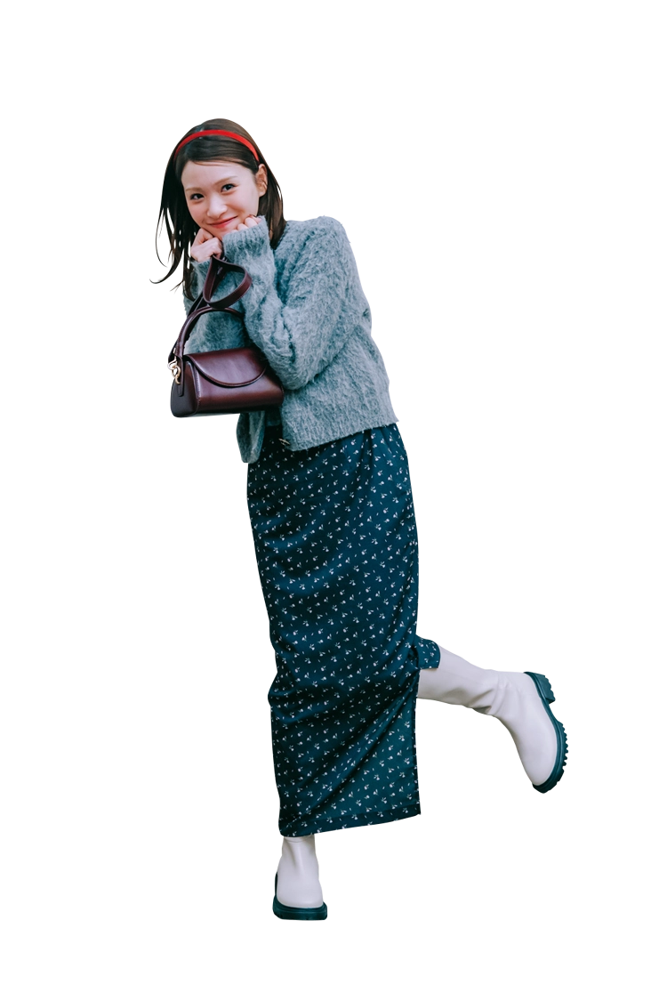 ニットカーディガンとビスチエのセット履き回し。花柄ナロースカート 17,600円/HONEY MI HONEY カチューシャ 8,030円/THE HAIR BAR TOKYO ハンドルバッグ 10,900円/チャールズ&キース(チャールズ&キース ジャパン)ロングブーツ 19,910円/RANDACordinate勝負服にぴったりなあざとコーデ