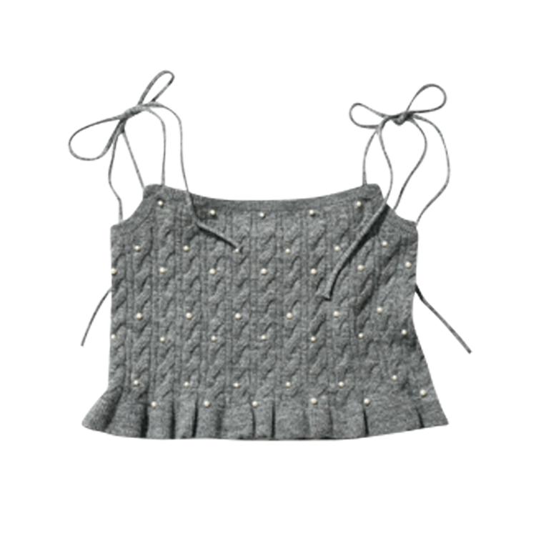 グレーにあわせてデニムも暗めなカラーをチョイス。一見シンプルに見えるけど、ビスチエのパールがさりげなく輝いてて可愛い♡