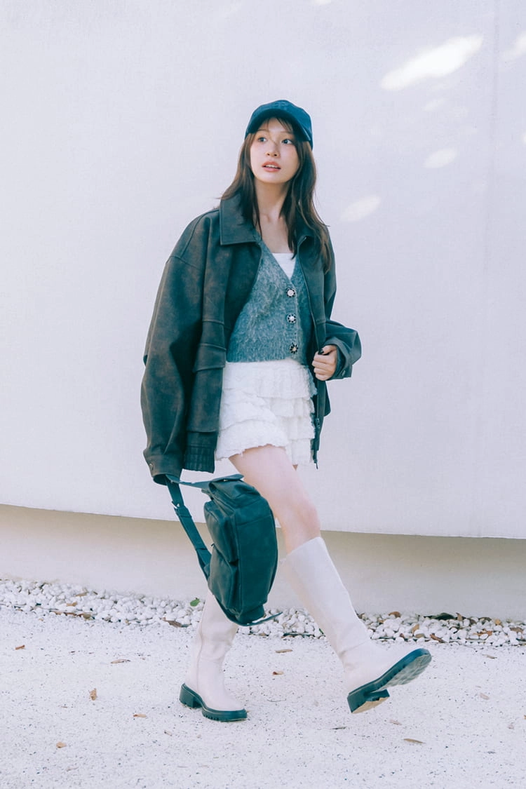 ニットカーディガン(ニットカーディガンとビスチエのセット)は着回し。レザーブルゾン 6,599円/WEGO ティアードミニスカート 9,640円/CRANK(HANA SHOWROOM)キャップ 9,900円/OVERRIDE(OVERRIDE 神宮前)バッグ 3,629円/WEGO ロングブーツ 19,910円/RANDA インナー/スタイリスト私物Cordinateトレンド感あふれるおしゃれ上級者コーデ