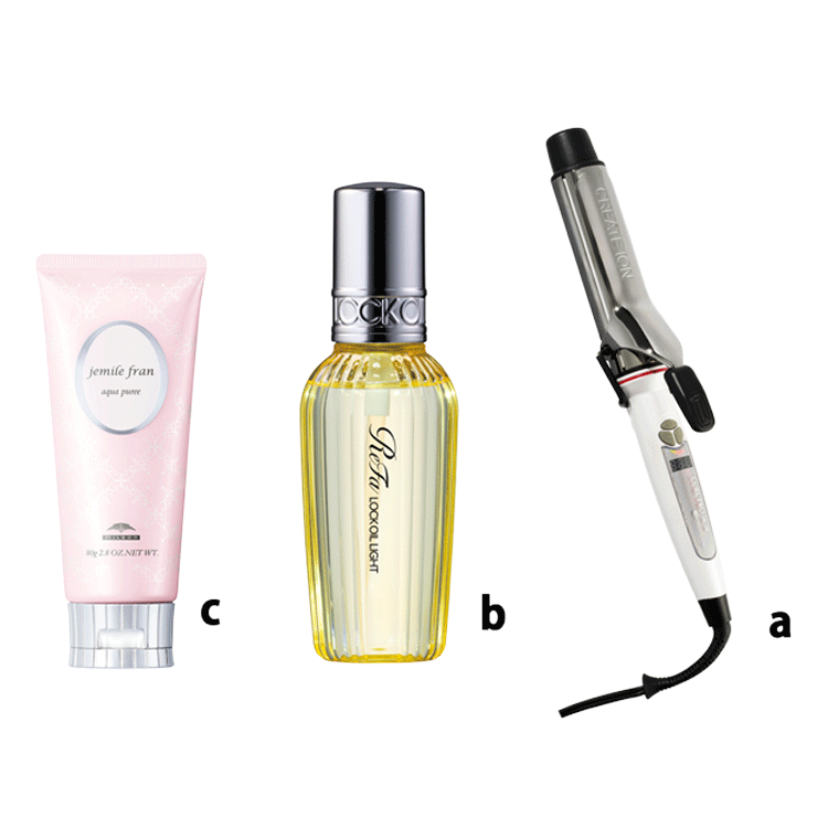 はじめにbをワンプッシュし、髪にまんべんなく広げる。次に髪をすべて前に持ってきたら、aで毛先を内にワンカール。
