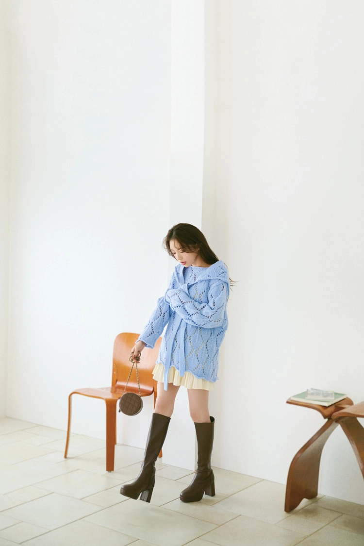 愛らしさを引き立てるブルーニットには、ロングブーツとチェ―ンバッグでオトナな色気も忘れず仕込んで♡