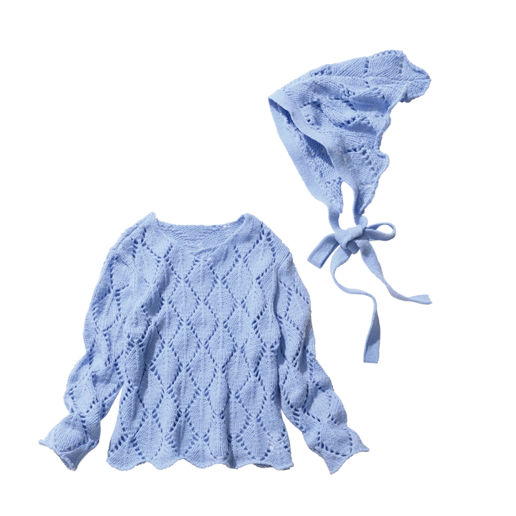 今季トレンドのニットバブーシュカはセットで賢くゲットして♡ ほっこり可愛いかぎ針編みニットは透明感アップなブルーでキレイめ要素をひとさじ。