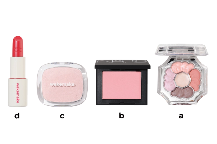 aの上と左の2色をブレンドし、上まぶた全体に塗る。下目尻の三角ゾーンには、上と右の2色を混ぜてオン。目頭には青みピンクの左をトッピングし、目元の華やかさを高めて。
